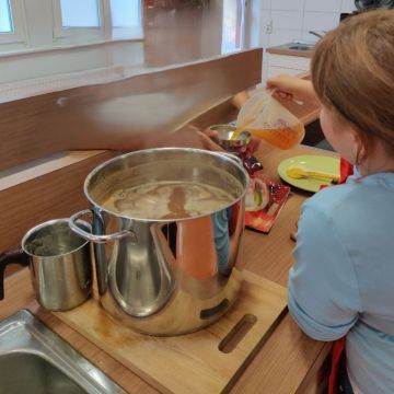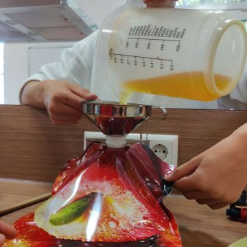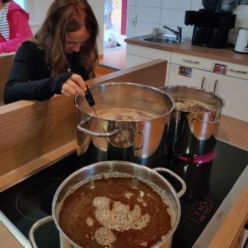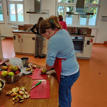 In der Schule verarbeiteten anschließend die Technik- und AES-Gruppen die Äpfel zu Saft. Im Wasserbad waschen, faulige Stellen entfernen, Äpfel zerkleinern und auspressen standen auf dem Programm.