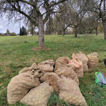Mit großen Säcken und viel Elan zogen die Gruppen los. Auf den Streuobstwiesen in der Umgebung wurde fleißig gesammelt, ob vom Boden aufgelesen oder direkt vom Baum – unsere Schülerschaft zeigte vollen Einsatz.