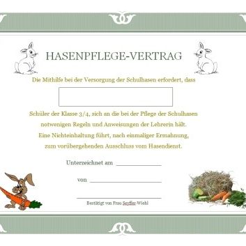 Im Laufe des Schulvormittags übernimmt jeweils eine Grundstufenklasse den „Hasendienst“, wobei dieser durch einen Versorgungsplan und auch Hasenpflegeverträge geregelt ist (siehe Galerie).